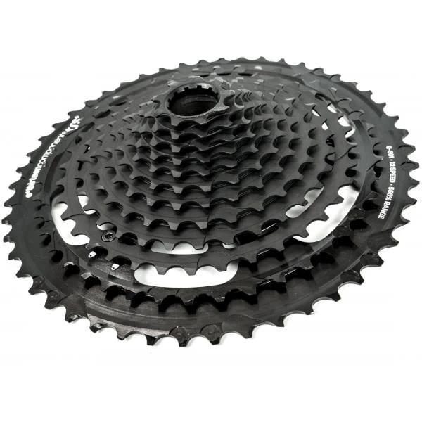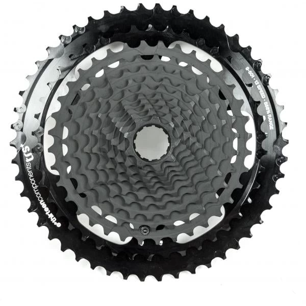 Les deux parties de la cassette sont assemblées au moyen d’une vis 3 mm Hex, simple et fiable. Remarquablement efficace, cette cassette est l’arme ultime de tous les amateurs d’Enduro, en loisir comme en compétition. De plus, la cassette TRS Plus offre la même plage de rapport de 556% avec la gamme Sram Eagle en 9-50 dents.