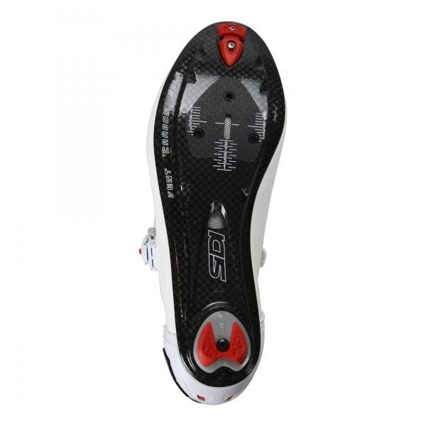 Ces chaussures SIDI sont notamment équipées de la semelle Vent Carbon, hyper légère et rigide, qui promet un transfert de puissance optimal à chaque coup de pédale ! Sa structure en carbone ménage une ouverture sous la pointe du pied qui permet de ventiler l’intérieur de la chaussure les jours de grande chaleur. Sinon, elle peut être recouverte par son cache amovible, si la température extérieure ne justifie pas une trop grande aération. Une protection trouve aussi sa place sous le talon, aidant le cycliste à marcher.